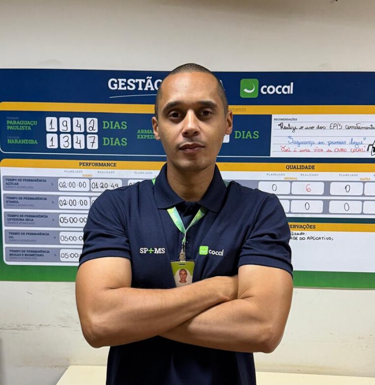 Leonardo Rufino de Souza está na empresa há mais de dezoito anos. Iniciou sua trajetória auxiliar no setor da Entomologia e, passou pelas funções de operador de motoniveladora, operador de colhedora e, agora, assume o cargo de encarregado agrícola em Preparo Solo na unidade Narandiba.